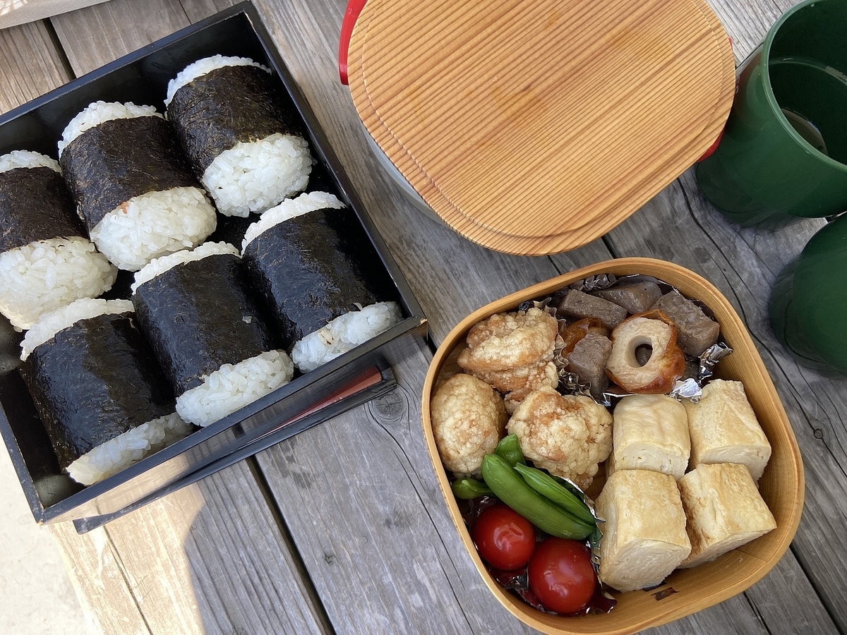 私達は展望台のベンチに座って、持参した弁当を食べました。汗をかいて山登りをした後に食べる弁当は、何にも増して美味いです。
